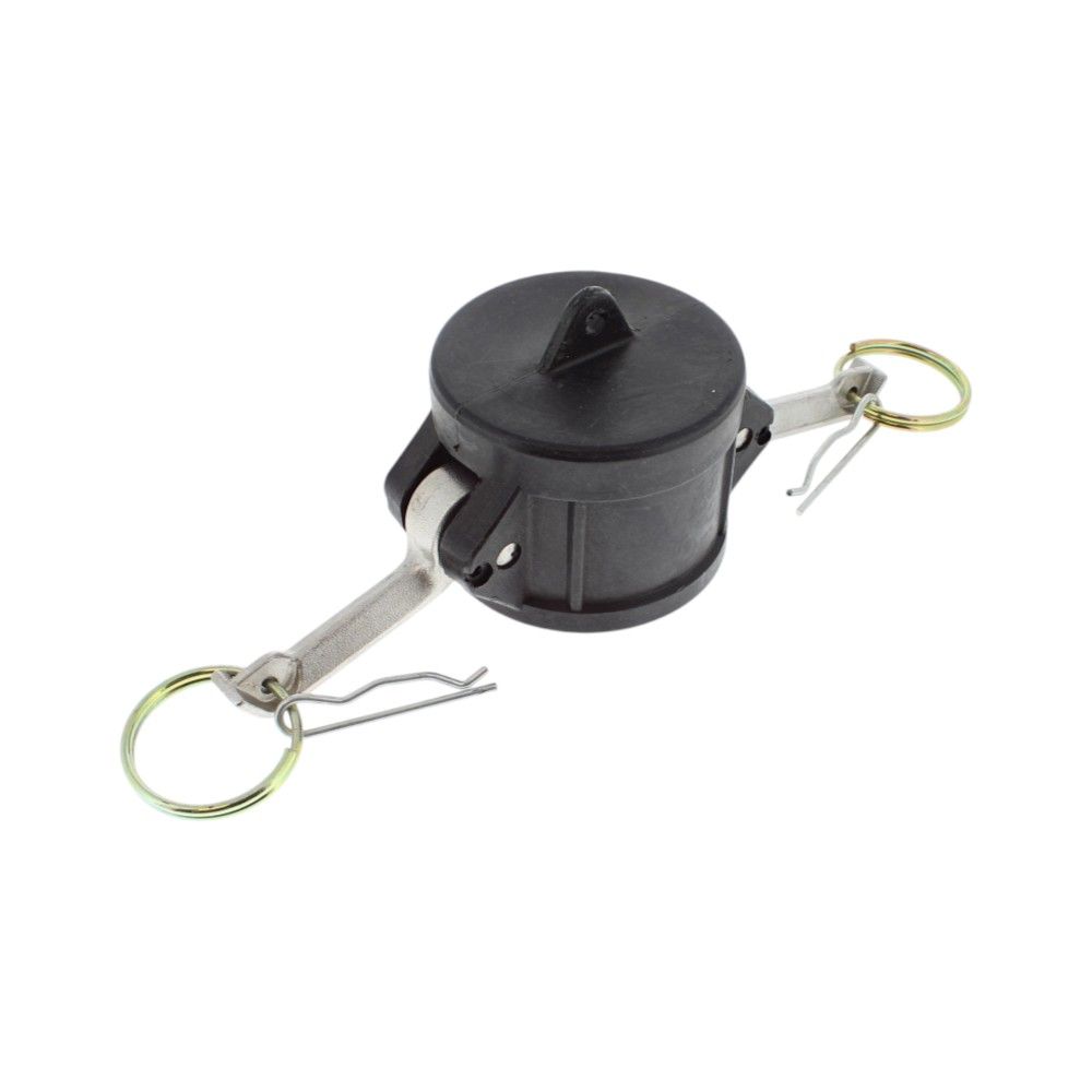 The 1-1/2 in (38 mm) Type DC Camlock Coupling Dust Cap is a Genuine Part made from black polypropylene and designed to protect cam and groove fittings when they are not in use. It closes off the open end of a male camlock adaptor to keep out dust, grit, and moisture, helping maintain clean, reliable connections. The lightweight, corrosion-resistant build is easy to handle on site and resists many common fluids. It locks in place with cam arms for a secure seal and quick, tool-free operation. Suitable for pumps, hoses, bowsers, sprayers, and transfer lines used around construction, agriculture, landscaping, and industrial plant. Type DC caps mate with male camlock adaptors (Types A, E, and F) of the same size.