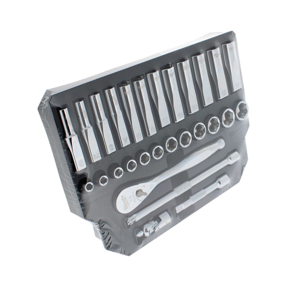 Milwaukee quarter‐inch (6.35 mm) drive metric ratchet and socket set, compact metric socket and ratchet kit, 28‐piece 1/4in metric socket assortment, small drive metric socket set, metric deep and standard socket kit for 1/4in drive.