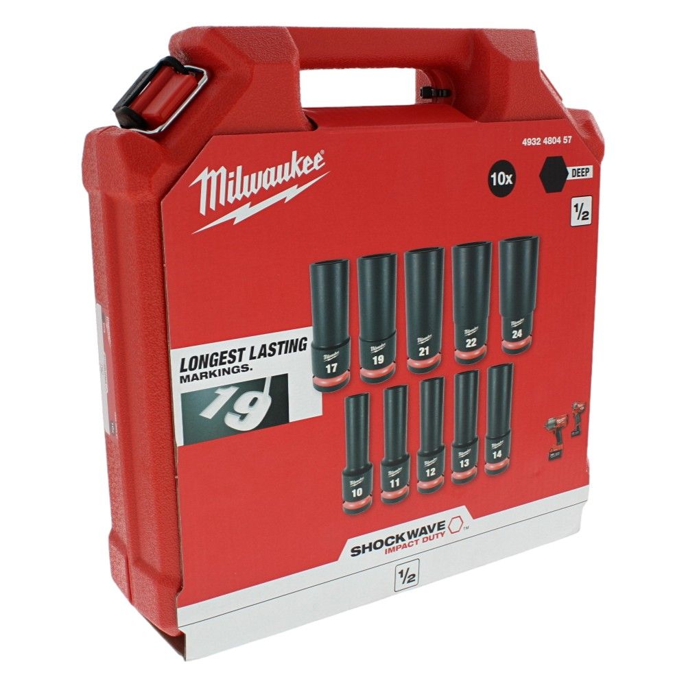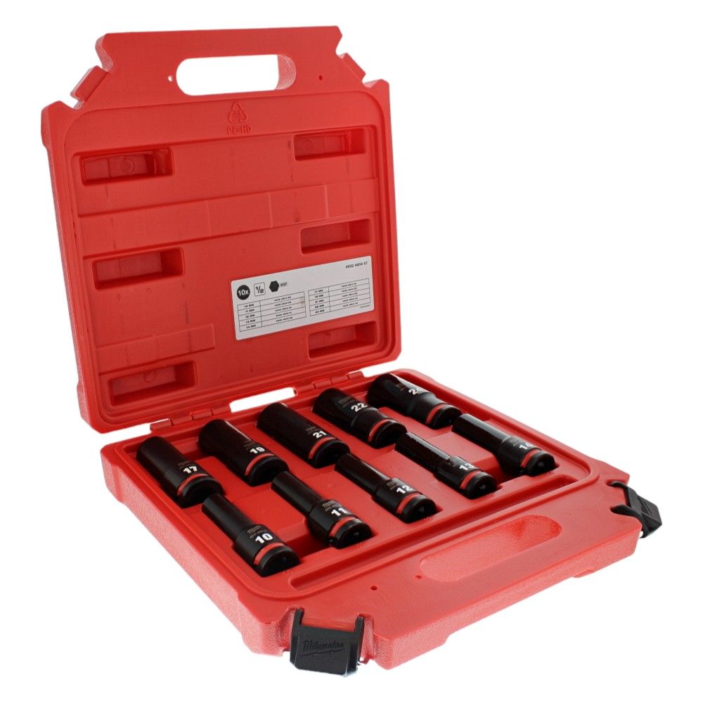 The Milwaukee 10 Piece 1/2" Hex Impact Socket Set (Deep) is a genuine Milwaukee set designed for heavy-duty fastening and loosening with impact wrenches and drivers. Built from high-strength alloy steel with a durable black finish, the sockets are engineered to handle repeated impact loads while maintaining accuracy. The deep form gives extra reach for recessed nuts and bolts and improves engagement on longer studs. Covering the most-used metric sizes from 10 mm to 24 mm (10, 11, 12, 13, 14, 17, 19, 21, 22, 24 mm), this set suits a wide range of repair and maintenance tasks on construction equipment and garden machinery. It fits any 1/2" (12.7 mm) square drive tool and is supplied in a sturdy case for organised storage at the workshop or on site. OEM No. 4932480457 confirms the correct genuine part.