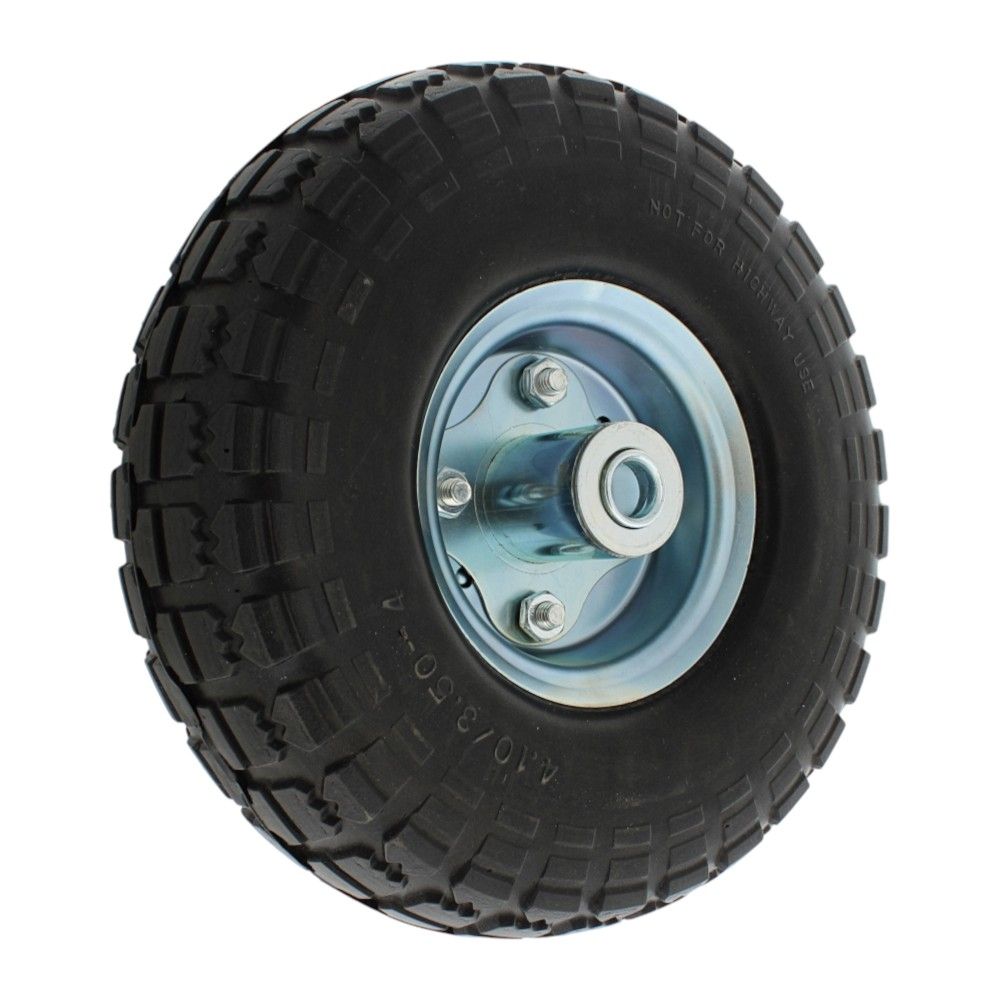 The 10" Puncture Proof PU Wheel with Bearings (4.10 x 3.50 x 4) is a Genuine Part built for hard use on site and around the garden. The tyre is moulded from PU foam, so it cannot puncture or deflate, and the robust metal centre provides solid support under load. With a 10 inch diameter (approx. 254 mm), it rolls smoothly over rough ground. The size marking 4.10/3.50-4 suits equipment that takes this common trolley and barrow tyre size: 4.10 in (approx. 104 mm) / 3.50 in (approx. 89 mm) on a 4 in rim (approx. 102 mm). A 16 mm bore and 55 mm hub length, together with fitted bearings, make installation straightforward on suitable axles. Ideal for wheelbarrows, launching trolleys, and utility carts where reliability and low maintenance matter.