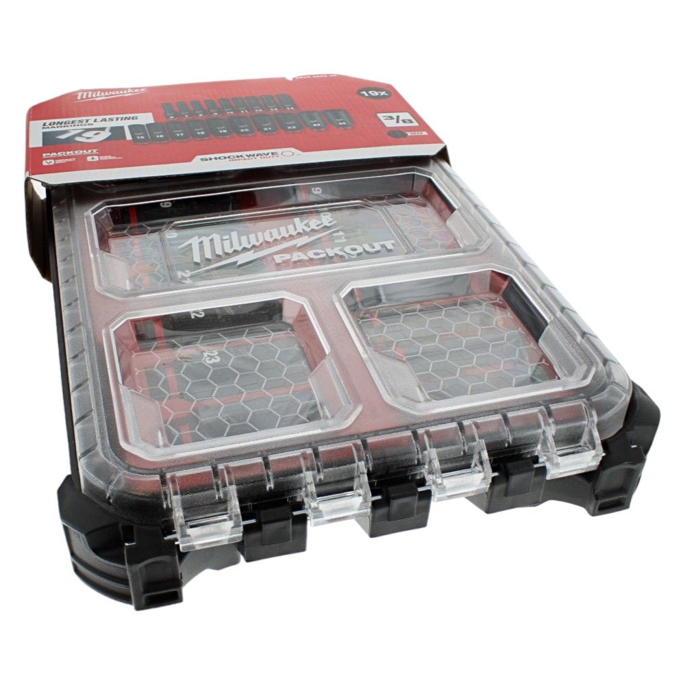 The 19 Piece Hex Socket 3/8" Deep Set Shockwave Packout is a genuine Milwaukee part designed for impact use on construction and garden machinery. Made from SHOCKWAVE IMPACT DUTY Chrome-Molybdenum (Cr-Mo) alloy steel, it offers high strength and durability under heavy torque. The 3/8" drive (9.5 mm) deep metric sockets cover 6 mm to 24 mm, giving broad coverage for common fasteners on equipment such as compactors, generators, mixers, mowers and ride-on garden machinery. Deep wall sockets provide extra reach over protruding studs and bolts. Clear size markings and a robust PACKOUT slim organiser help you work efficiently on site or in the workshop. Genuine Part, OEM No. 4932480946.