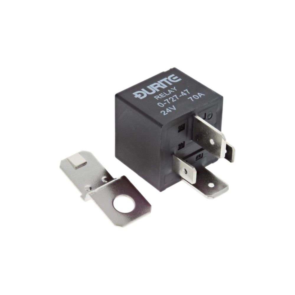 The 24V Mini Heavy Duty Make/Break Relay, Sealed (70A) is a robust component designed for reliable performance in various electrical systems. Manufactured by Durite, this genuine part is crafted to handle heavy-duty applications, ensuring efficient operation in both construction and garden machinery. The relay is sealed for enhanced protection against environmental factors, making it suitable for outdoor and demanding conditions. It features a compact design with a bracket for easy installation, making it an ideal choice for tradespeople and DIY enthusiasts alike.