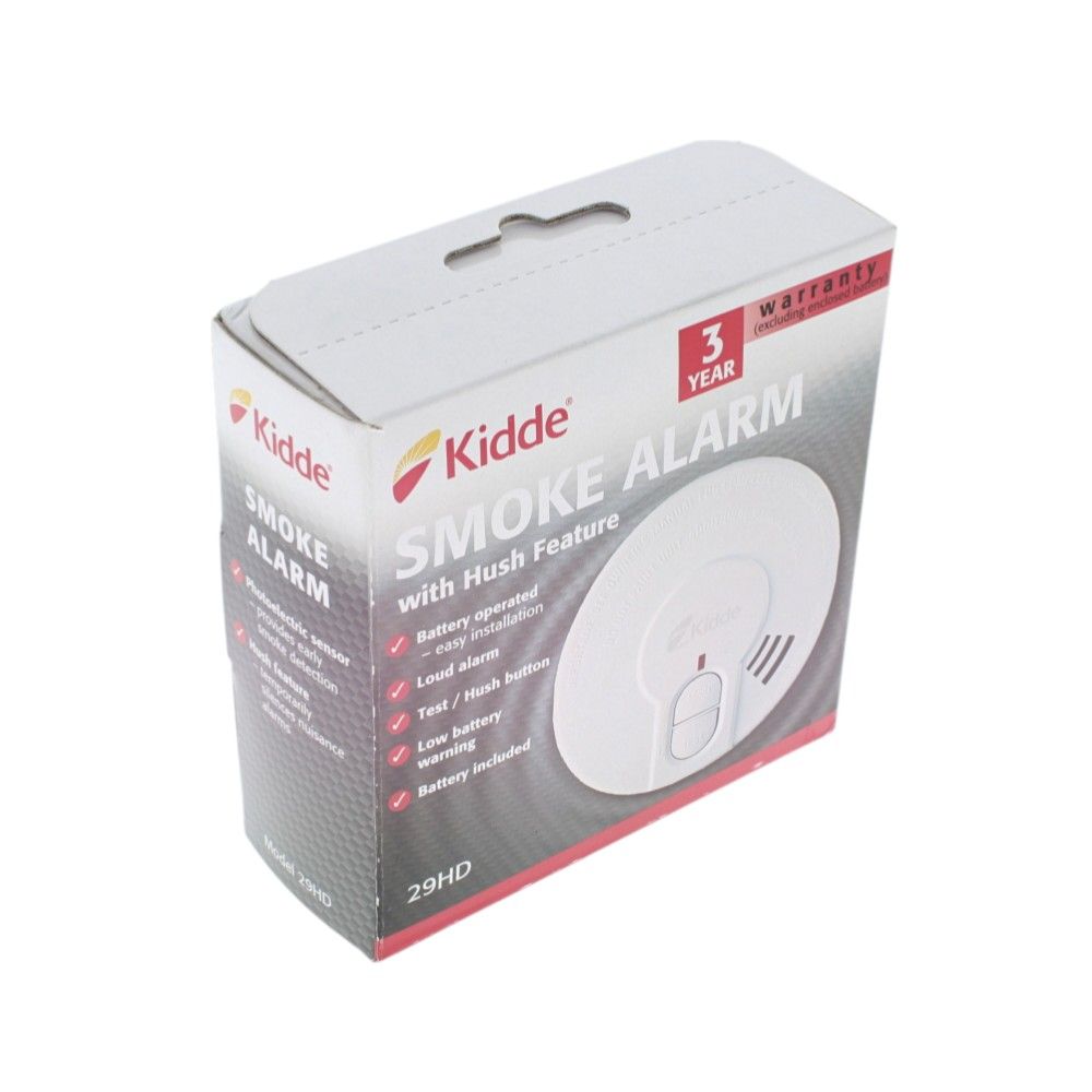 The Kidde 29HD Optical Smoke Alarm is an essential household safety device designed to provide early warnings of potentially deadly fires. This battery-operated alarm is equipped with advanced optical smoke sensing technology, making it highly responsive to slow-burning fires while minimizing false alarms caused by cooking vapors. Featuring a loud 85dB alarm to ensure you are alerted at the first sign of smoke, the 29HD model is ideal for installation in key living areas, including bedrooms. It includes a test button for routine functionality checks and a Hush™ button to silence unnecessary alarms, combining safety with convenience. Endorsed with an EN 14604 approval and CE marking, this reliable smoke alarm comes with a 5-year manufacturer's warranty and a 9V battery, making it ready to protect your home immediately.