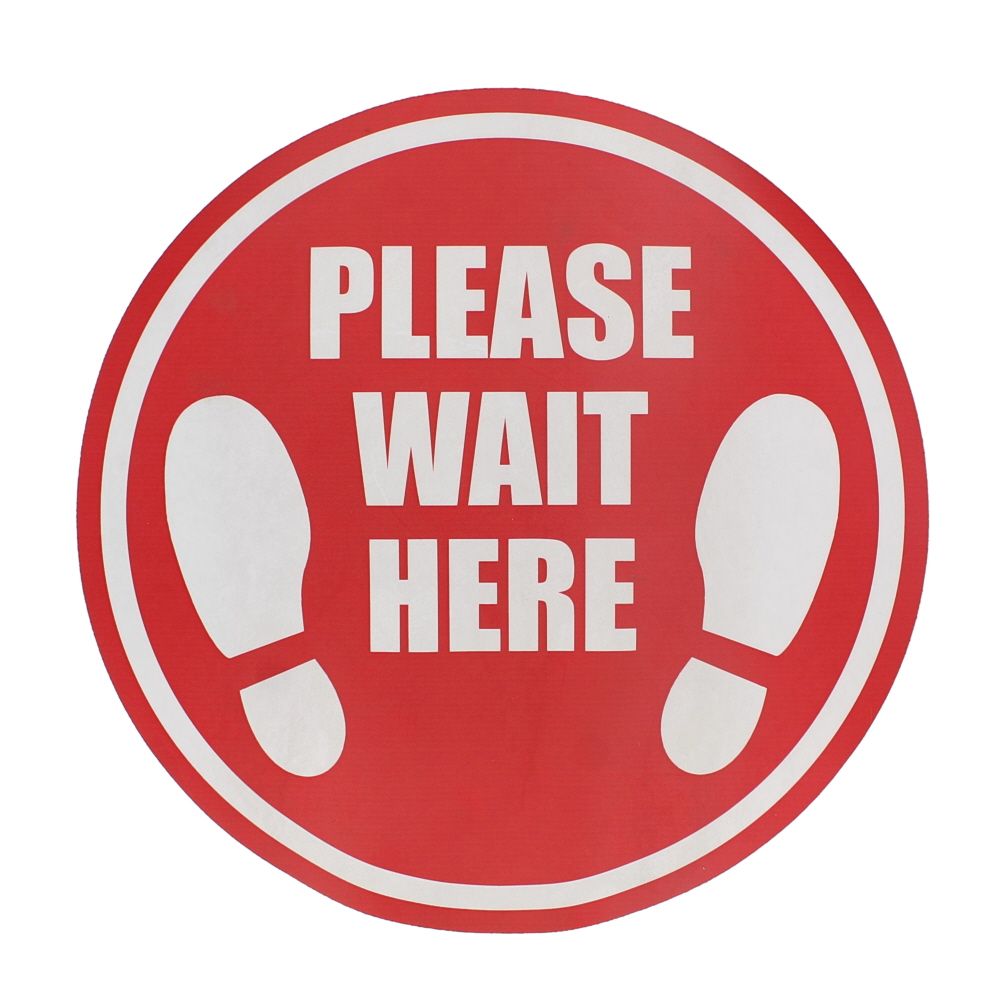 Queue marker, wait point sticker, floor graphic, floor marker, distancing sticker, "wait here" floor sign, adhesive floor decal, queue management floor label, social distance marker, indoor floor signage.