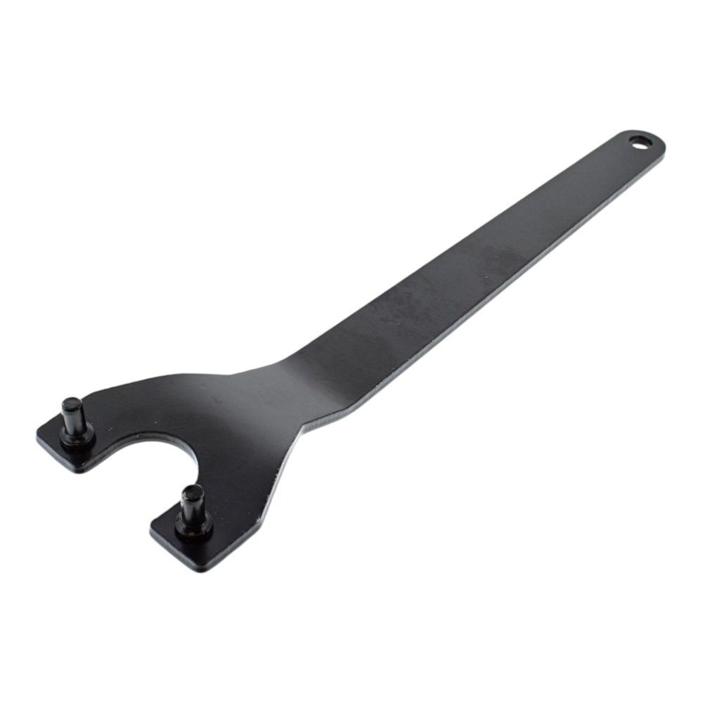 Grinder wrench, disc spanner, pin spanner, two-pin spanner, face spanner, flange nut wrench, lock-nut spanner, peg wrench, two-hole spanner, spindle nut tool. These terms all refer to the same style of tool used to engage the two holes in an angle grinder's flange or lock nut for safe tightening and removal.