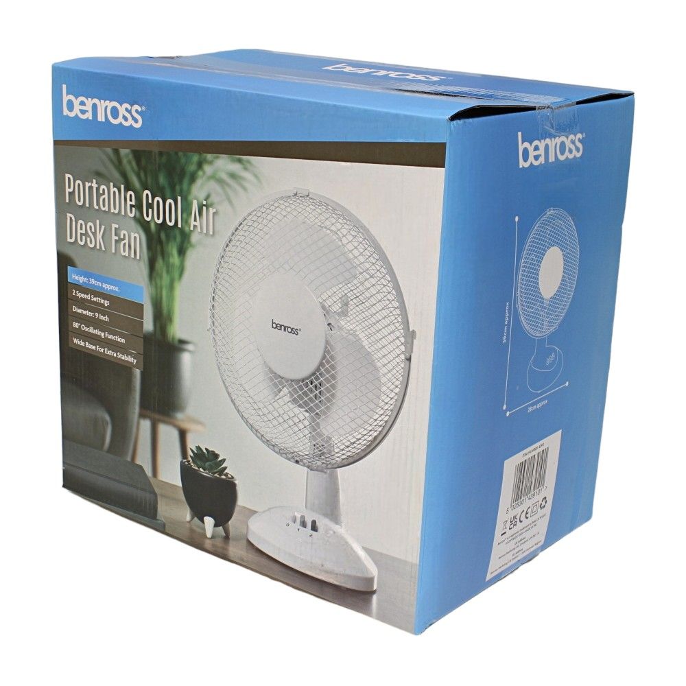 This portable 9-inch (23 cm) white desk fan provides reliable personal cooling for offices, workshops, site cabins, garages, and home spaces. It uses a compact, hard-wearing plastic body with a stable base and a front safety grille to help protect fingers and debris from the blades. The fan delivers steady airflow from a 3-blade rotor with two selectable speeds, while 90° oscillation helps move air across a wider area. Simple three-button controls make it straightforward to operate. With a low 21 W power draw and 220-240 V mains operation, it offers efficient performance for everyday use. A 1.5 m power cable allows flexible placement on desks, shelves, or workbenches, and the overall height of about 39 cm suits most worktops and tables.