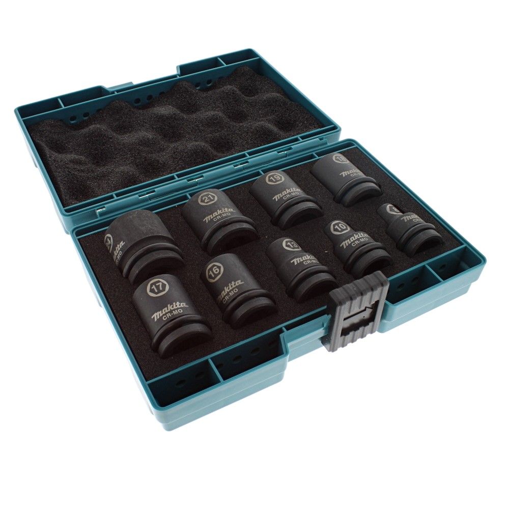 The Makita 9pc Impact Socket Set (1/2" Sq) - OEM No. E-16564 is an indispensable collection of high-quality impact sockets designed specifically for heavy-duty tasks. Crafted from robust materials to ensure durability and longevity, this genuine Makita part provides the reliability and performance expected from a leading brand in the tools and machinery sector. Designed to fit a variety of bolts and nuts with diameters ranging from 8 mm to 24 mm, these sockets are ideal for use with any tool requiring a 1/2 inch square drive. Whether you're a professional tradesperson or a DIY enthusiast, this socket set ensures efficient and effective task completion across a wide range of applications.