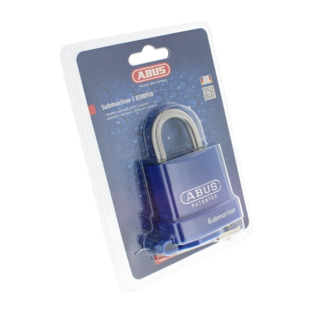 The Abus 83WPIB/53 Submariner Rust Proof Padlock is a genuine marine‐grade padlock designed for harsh outdoor environments. Built with a stainless steel shackle and a chrome‐plated brass core protected by a high‐impact plastic jacket, it resists corrosion and physical wear on site. Shackle seals and a covered keyway help keep out water, salt, and dirt, while a drill‐resistant ball bearing locking mechanism provides secure fastening. Ideal for securing site gates, chains, hasps, tool chests, plant rooms, and storage on construction and agricultural equipment, it performs reliably around seawater and exposed weather. The 83WPIB/53 Submariner is a robust choice for wind farms, docks, yards, and coastal facilities where long‐term rust protection and dependable security are essential. Genuine Abus part.