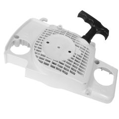 Today, we're going to change the Starter Rope on a Stihl MS180 Chainsaw. Using a torx spanner, remove the screw holding the handle in place using a torx spanner. You will need to lift the hand guard out of it's position. Then unscrew and fully remove the fuel filler & oil filler caps. It would be a good idea to do this repair when the tanks are empty. Then remove the three remaining torx screws holding the recoil assembly on. This will release the recoil assembly. Remember to remove the model plate if you are not replacing it, this can be attached to your new recoil assembly. Pull the recoil to it's maximum length, and stop it from returning by holding the pulley. Once at maximum length, feed the pulley back round the other way to loosen it and release the tension. Now the tension has released use pliers to remove the R Clip, washer and pawl. Once these are you can completely remove the pulley. Untie the knot at the end of the recoil rope, as a tip you can use pliers to help. Once that's released completely detach from the recoil and starter handle. Feed your new starter rope through the top of the starter handle. Tie a tight knot at the top of the handle so it doesn't feed all the way through. Make sure this is secure. Feed the rope through the hole at the top of the recoil assembly. Next, feed the rope through the side of the pulley until it reaches the hole in the middle, then pull through the hole. Once through, tie another tight knot to hold the rope in place. Tuck the excess rope in, and make sure it's tight. Feed the rope clockwise around the pulley approximately three times and seat back in the assembly. Seat the pawl and the washer making sure they're seated correctly. Using the pliers, grip the R clip and fix back into position over the washer. Once they're secure force the rope clockwise around the pulley three times to create tension for the recoil. Check that the recoil has enough tension by pulling it. You may need to further tighten the rope. After you have placed the recoil assembly on to your machine check that the pulley is free, with tension. Place the hand guard back into its position, and secure with the screw. Then fix the three remaining screws back onto the recoil assembly. Now screw the fuel fillers caps back into the machine. That's how you change the Starter Rope on a Stihl MS180.