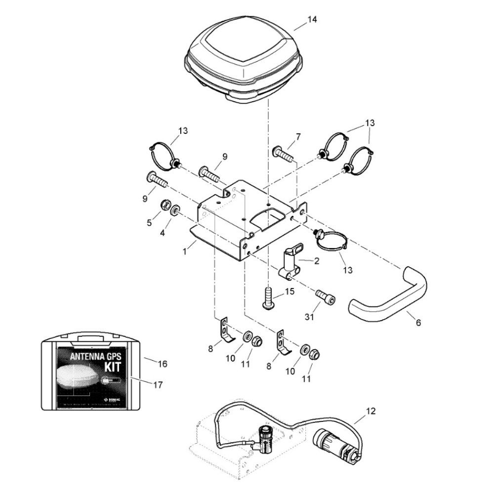 The Aerial Assembly for the Bomag BW 120 AD-5 CC Roller is designed to ensure optimal communication and control during operation. This assembly is crucial for maintaining the roller's performance, providing reliable signal reception and transmission. Components typically include antennas, mounts, and connectors, all tailored to fit the Bomag model precisely.