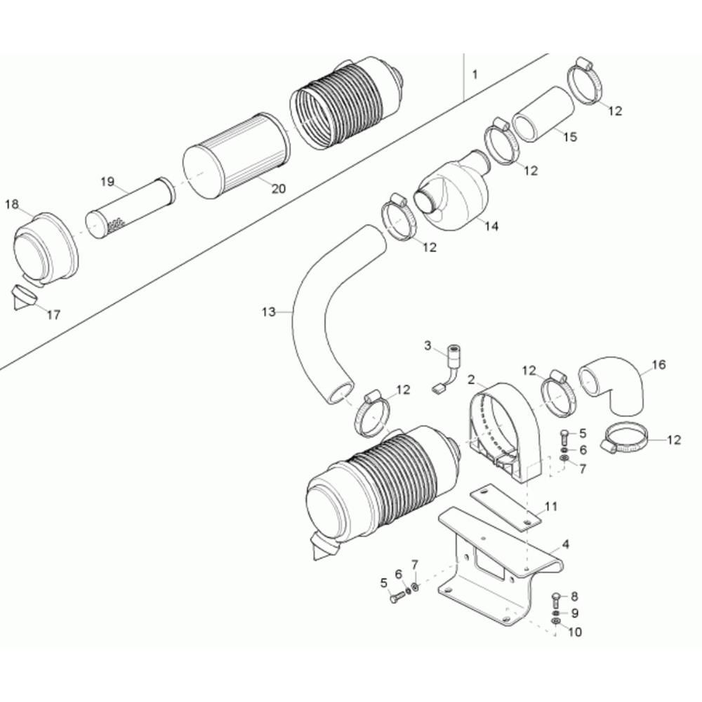 The Air Cleaner Assembly for the Neuson 38Z3 Mini Excavator is designed to ensure optimal engine performance by filtering out dust and debris. This assembly includes components such as filters, hoses, and clamps, essential for maintaining clean airflow and protecting the engine from contaminants. Suitable for routine maintenance and repair, it helps extend the service life of your excavator.