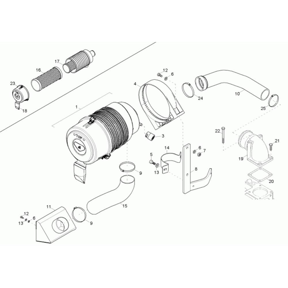 The Air Cleaner Assembly for the Neuson 6001 Dumper is designed to ensure optimal engine performance by filtering out dust and debris. This assembly includes essential components such as filters, seals, and clamps, which help maintain clean airflow and protect the engine from wear. Suitable for routine maintenance, it supports the longevity of your Wacker Neuson equipment.