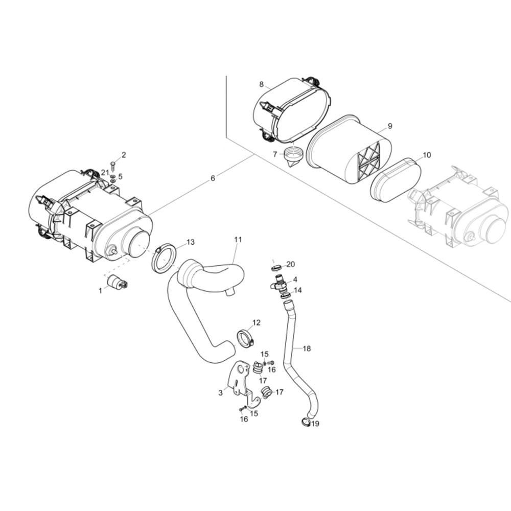 The Air Cleaner Assembly for the Wacker Neuson DW90 Dumper is designed to ensure optimal engine performance by filtering out dust and debris. This assembly includes components such as filters, seals, and clamps, which are essential for maintaining clean airflow and protecting the engine from wear. Suitable for routine maintenance and repairs, it helps extend the service life of your dumper.