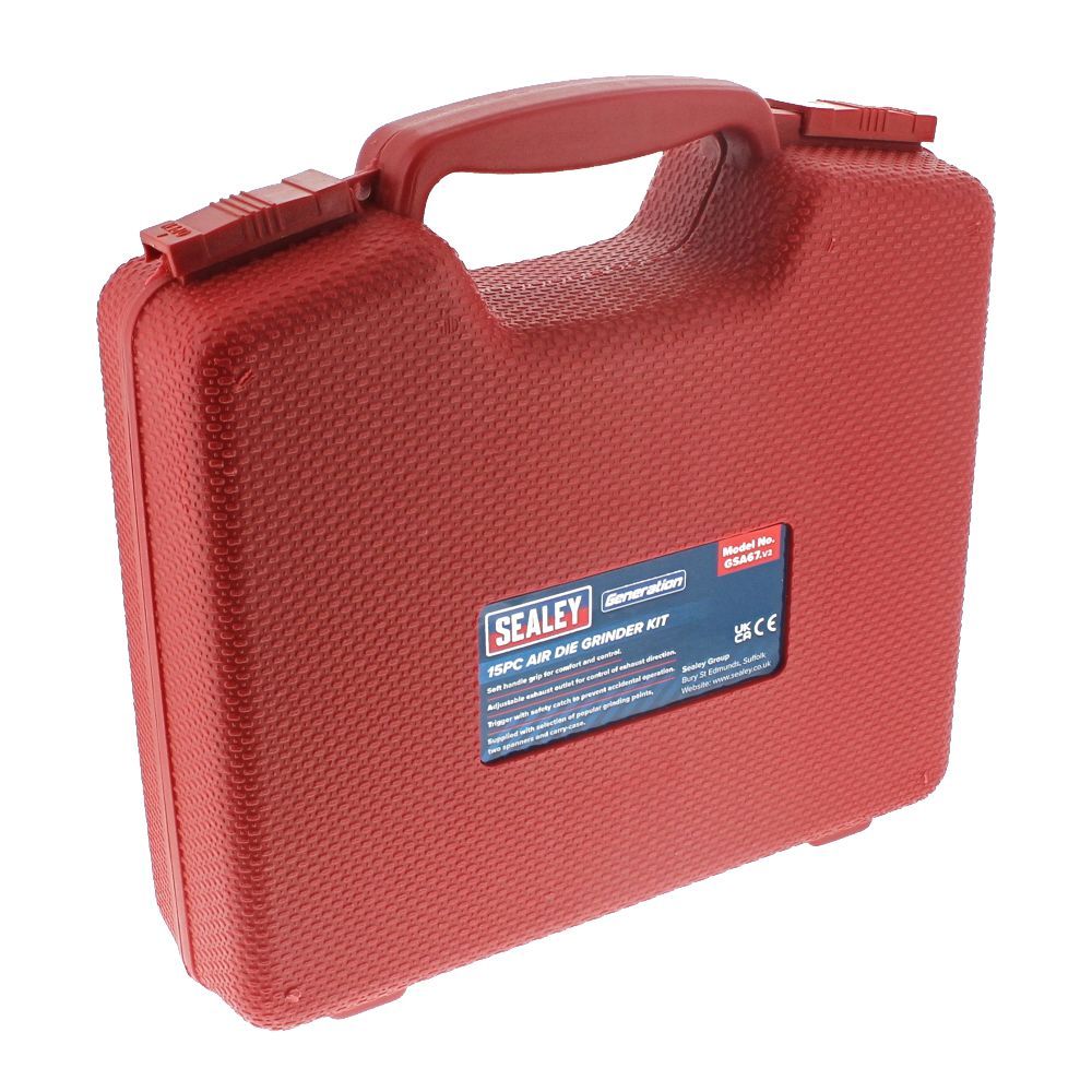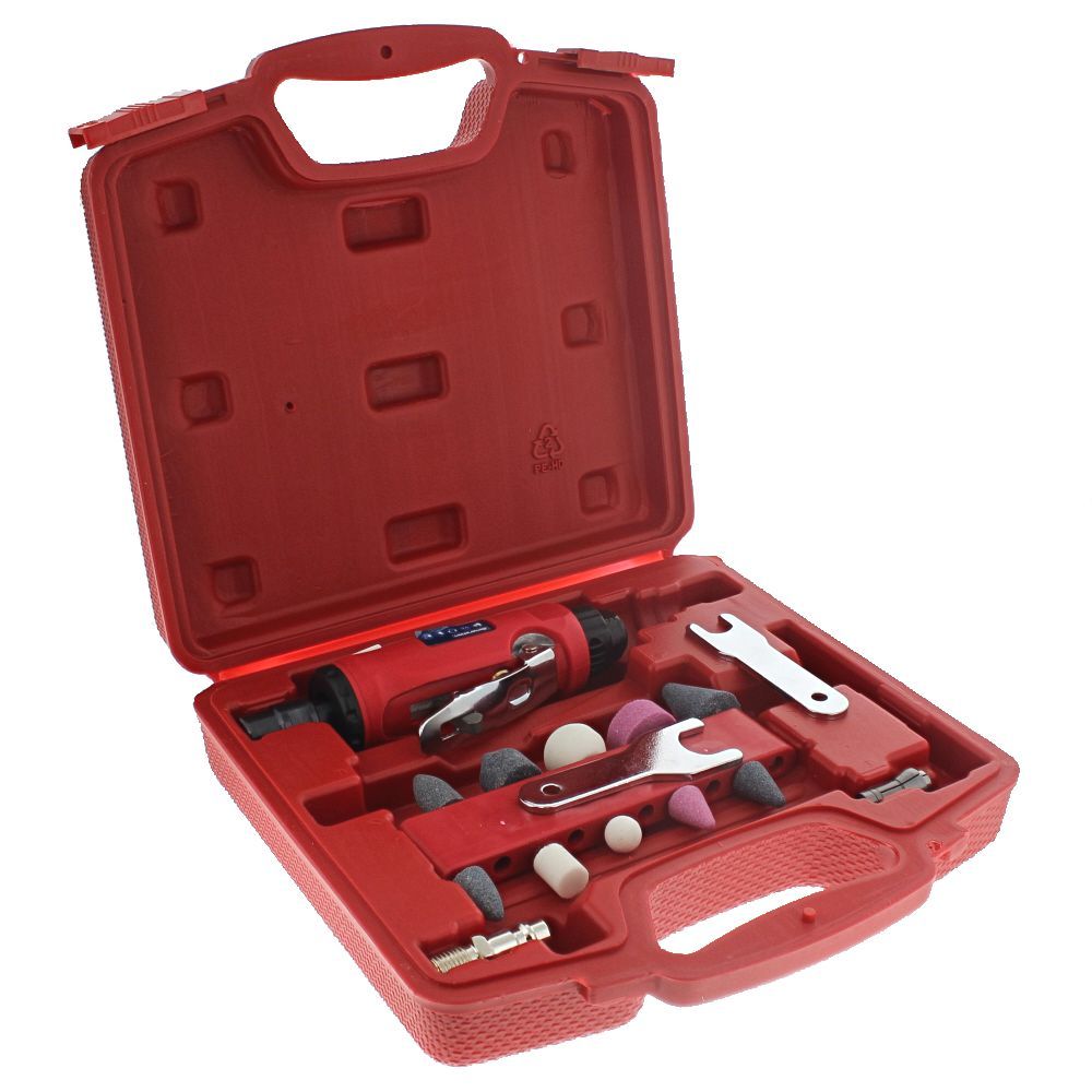 The Sealey Air Die Grinder Kit (15 Pieces) - Part No. GSA67 - is a straight-body pneumatic grinder for precision metalworking and automotive tasks. Built with a durable alloy body and a contoured composite grip, it helps reduce chill and vibration during prolonged use. The tool runs at a free speed of 22,000 rpm and is supplied with 3 mm and 6 mm collets to suit common mounted points and rotary abrasives. A directional, low-noise exhaust rotates 360 degrees to keep airflow under control. The kit connects to standard workshop airlines via a 1/4 BSP (6.35 mm) inlet and operates at 90 psi (6.2 bar). Supplied with an assortment of grinding points, chuck spanners, and a sturdy blow-moulded carry case, it's well suited to bench and mobile work.