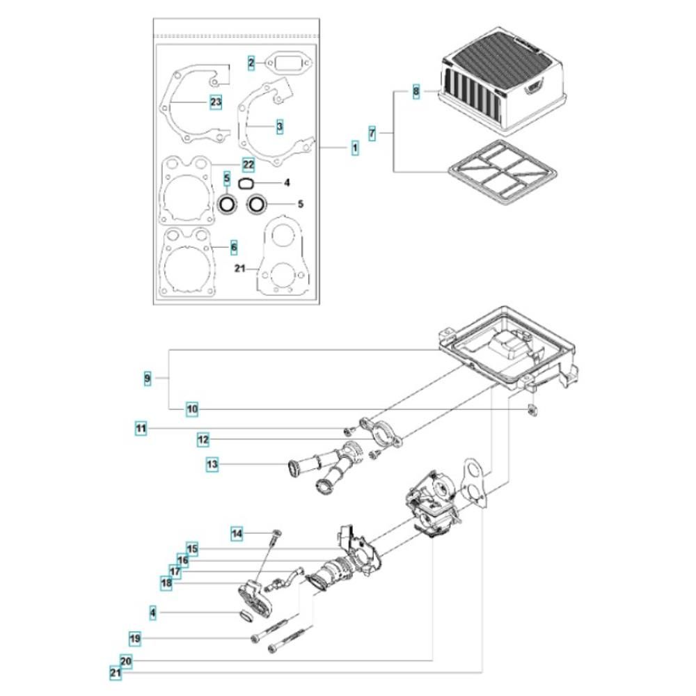 The Air Filter Assembly for the Husqvarna K770 VAC Disc Cutter ensures optimal performance by maintaining clean airflow to the engine. This assembly includes genuine Husqvarna parts designed to protect the engine from dust and debris, reducing wear and extending the machine's service life. Essential components such as hoses, clamps, and seals are available to support routine maintenance and repair.