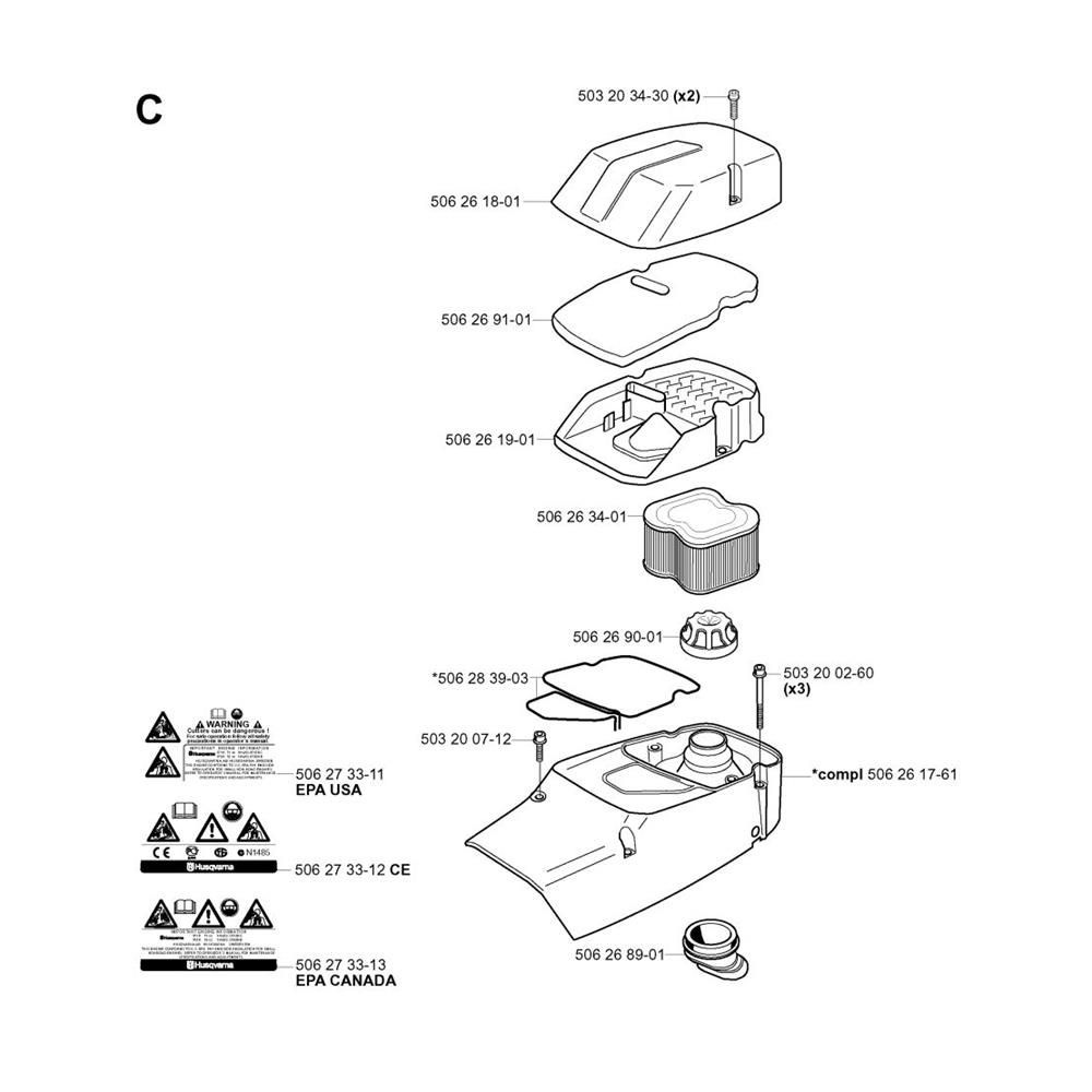 The Air Filter Assembly for the Husqvarna 375K Disc Cutter is designed to ensure optimal performance by maintaining clean airflow to the engine. This assembly includes essential components such as filters, seals, and clamps, which help protect the engine from dust and debris, reducing wear and extending the machine's service life. Ideal for regular maintenance and repair, it supports the reliable operation of your disc cutter.