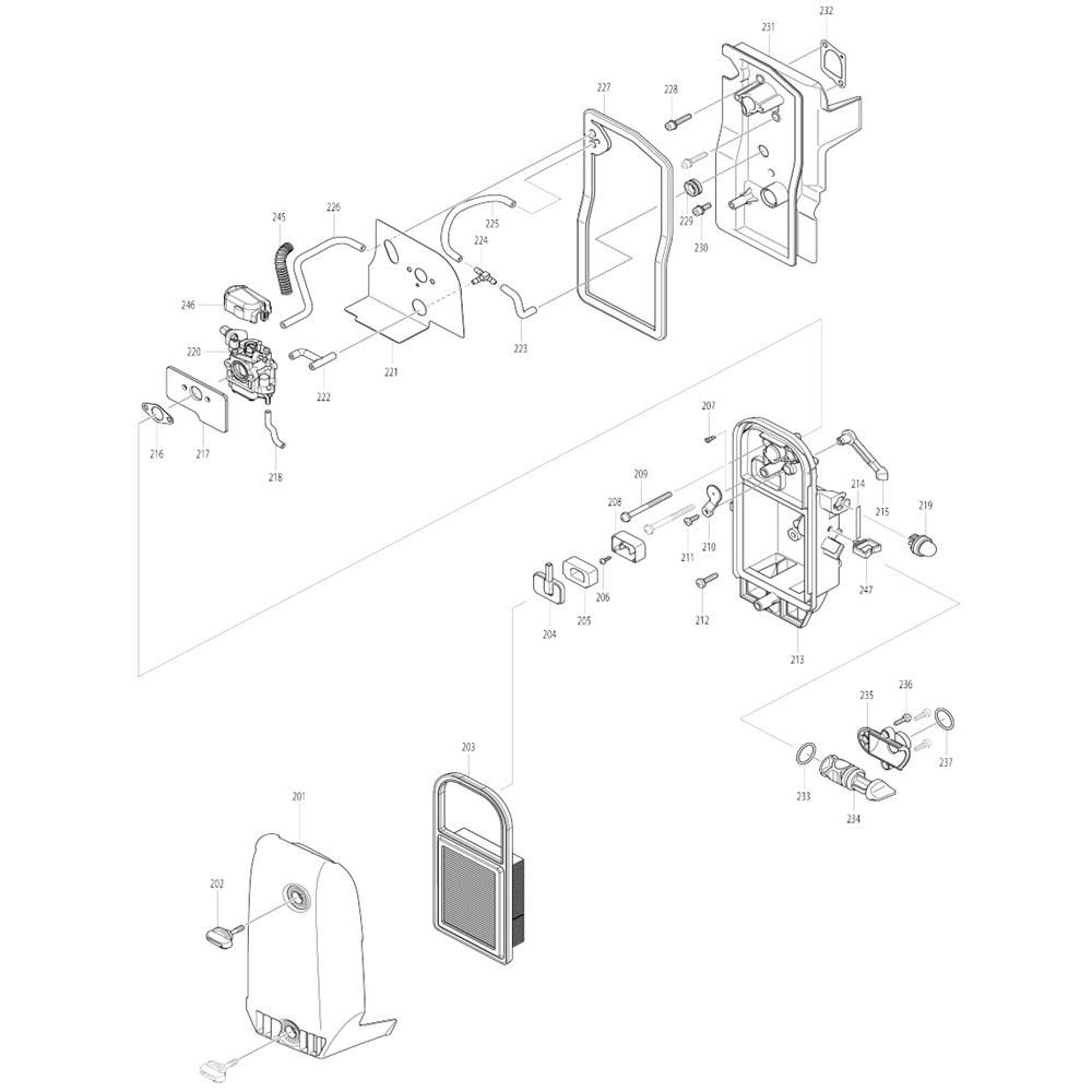 The Air Filter Assembly for the Makita EB7660TH Blower is designed to ensure optimal performance by providing clean airflow to the engine. This assembly helps protect the blower from dust and debris, reducing wear and extending its service life. Components such as hoses, clamps, and seals are included to facilitate routine maintenance and repairs.