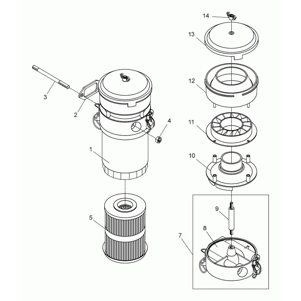 The Air Filter Assembly for the Wacker DFS90 Floor Saw is designed to ensure optimal performance by maintaining clean airflow to the engine. This assembly helps protect the engine from dust and debris, reducing wear and extending the machine's service life. Components include hoses, clamps, and seals, essential for routine maintenance and repair.