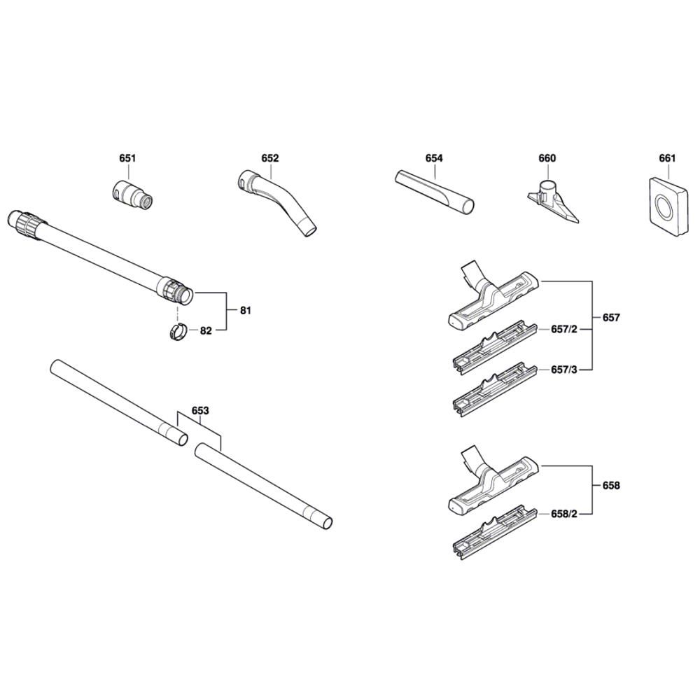 The All Purpose Vacuum Cleaner Assembly for the Bosch UniversalVac 15 includes essential components to ensure optimal performance and longevity. This genuine Bosch assembly helps maintain suction power and efficiency by replacing worn or damaged parts. Typical components include filters, hoses, and nozzles, designed to fit seamlessly with your Bosch vacuum cleaner.