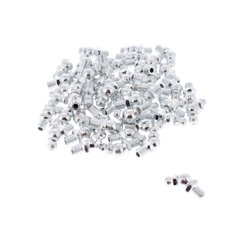 The 1/4" UNF, 45 Degree Angled Grease Nipples in a pack of 50 offer a pragmatic solution for hydraulic and lubrication systems across a variety of tools and machines. These components are designed with a 45-degree angle rotation making them easy to fit in tight spaces and ensuring that maintenance tasks can be carried out with greater efficiency. Manufactured from materials that are highly durable and resistant to corrosion, these grease nipples are built to withstand the rigors of daily use in demanding environments, making them a reliable choice for professionals and DIY enthusiasts alike. Suitable for a wide range of hydraulic applications, these angled grease nipples ensure the longevity and proper functioning of your machinery.