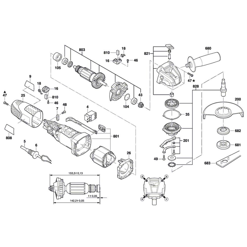 The Angle Grinder Assembly for Bosch PWS 700-115 includes genuine Bosch spare parts essential for maintaining and repairing your grinder. This assembly ensures optimal performance and longevity by replacing worn components. Typical parts include gears, bearings, and switches, designed to fit seamlessly with your Bosch model.