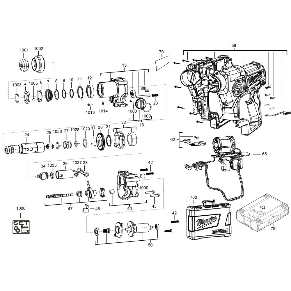 The Assembly for the Milwaukee M12CH Compact Hammer includes genuine spare parts designed to maintain the tool's performance and longevity. Essential for routine maintenance and repairs, this assembly ensures optimal operation by replacing worn or damaged components. Typical parts available include gears, bearings, seals, and switches, all tailored to fit the M12CH model.