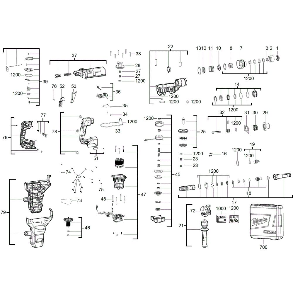 This assembly for the Milwaukee M18FHM SDS Max Drill includes genuine spare parts essential for maintaining optimal performance. Designed to support the drill's functionality, it features components such as gears, bearings, and seals. These parts ensure the drill operates efficiently, reducing wear and extending its service life.