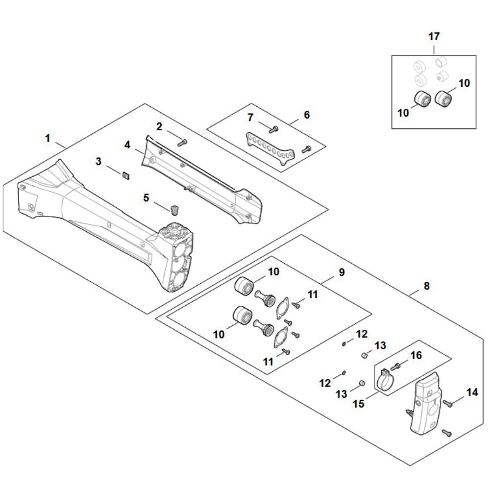 The AV System Assembly for Stihl FSA 400 Brushcutters is designed to enhance user comfort by reducing vibration during operation. This genuine Stihl part includes components such as dampeners, springs, and mounts, ensuring optimal performance and longevity. Ideal for maintaining the efficiency and comfort of your brushcutter, this assembly is essential for routine maintenance and repair.