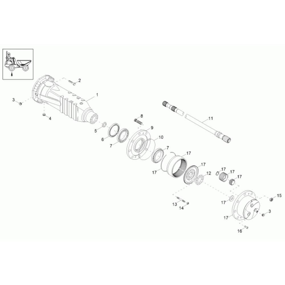 The Axle Case and Wheel Hub Assembly for the Neuson 9001 Dumper includes vital components for maintaining the vehicle's stability and performance. This assembly ensures smooth operation and efficient load handling. Components such as bearings, seals, and fasteners are integral to the assembly, providing durability and reliability in demanding conditions.