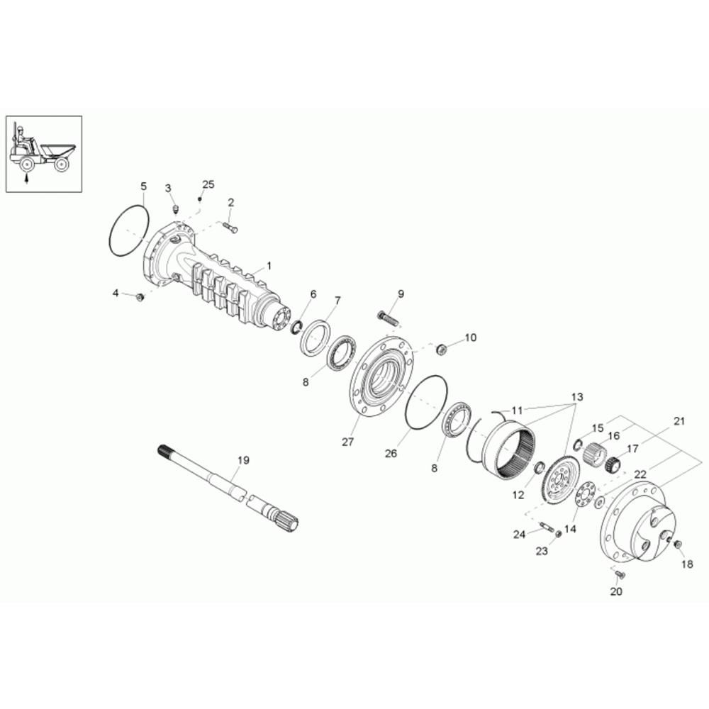The Axle Case and Wheel Hub Assembly for the Wacker 6001 Dumper includes essential components to ensure optimal performance and durability. Designed for the Wacker Neuson Dumper, this assembly helps maintain the vehicle's stability and load-bearing capabilities. Components such as bearings, seals, and flanges are integral to its function, providing reliable operation in demanding environments.