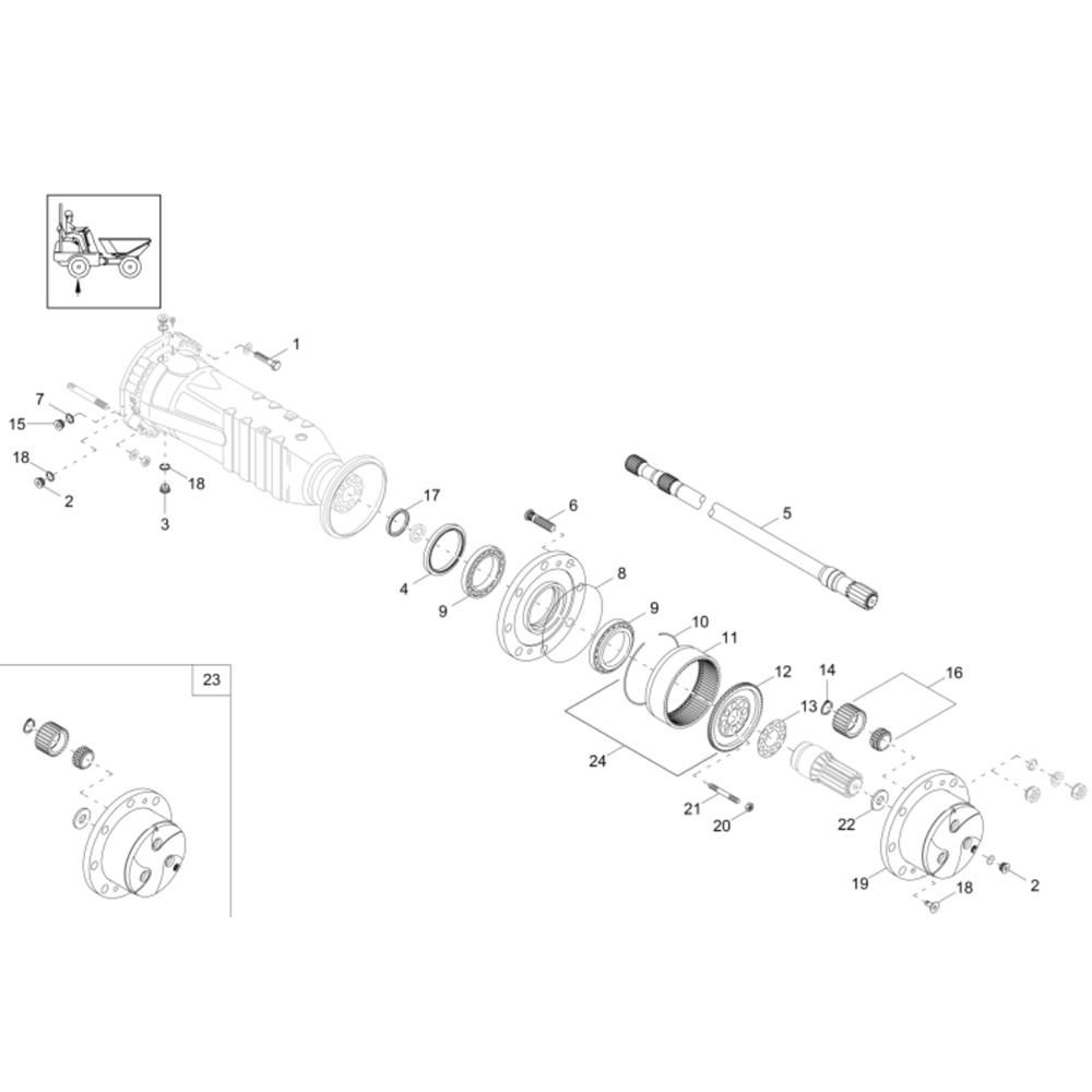 The Axle Case and Wheel Hub Assembly for the Wacker DV90 Dumper ensures optimal performance and durability. This assembly includes critical components such as bearings, seals, and flanges, which are essential for smooth operation and load handling. Designed for the Wacker Neuson model, it supports the dumper's mobility and stability in various work environments.