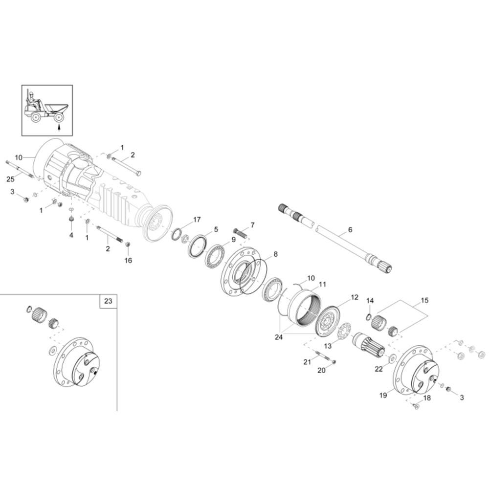 The Axle Case and Wheel Hub Assembly for the Wacker DV60 Dumper includes essential components for maintaining optimal performance. Designed to support the dumper's load-bearing capacity, this assembly ensures smooth operation and durability. Available parts include bearings, seals, and fasteners, all tailored for the Wacker Neuson model.