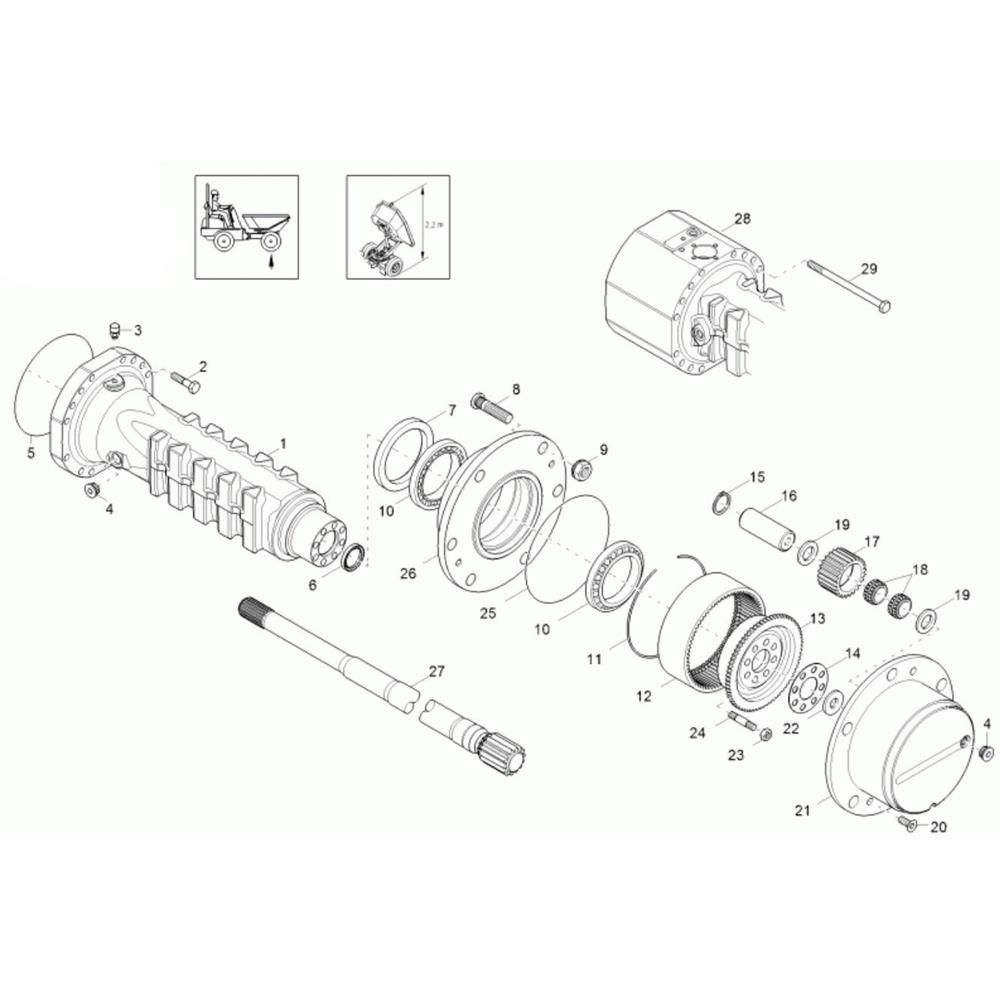 The Axle Case and Wheel Hub (Front) Assembly for the Neuson 3001 Dumper includes vital components for maintaining the vehicle's front-end stability and performance. This assembly ensures smooth operation and durability under heavy loads. Typical parts include bearings, seals, and fasteners, designed to withstand demanding conditions.