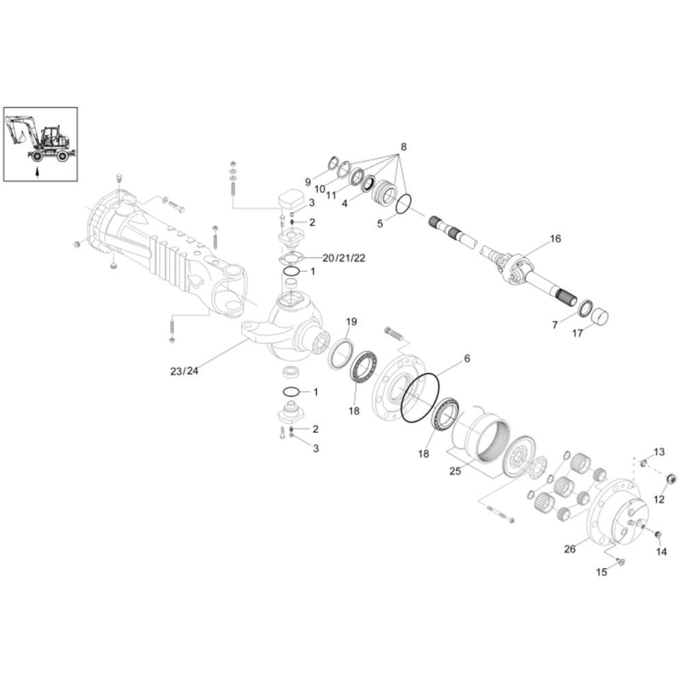 The Axle Case and Wheel Hub Assembly for the Wacker EW100 Excavator includes key components essential for the machine's mobility and stability. This assembly ensures smooth operation and effective load distribution. Genuine Wacker Neuson parts are used to maintain the excavator's performance and reliability. Components such as bearings, seals, and shafts are included to support the excavator's front wheel functionality.
