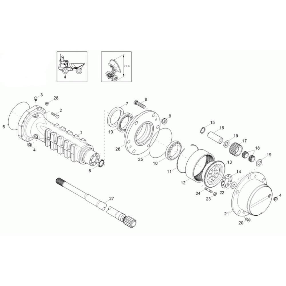 The Axle Case and Wheel Hub (Rear) Assembly for the Neuson 3001 Dumper includes key components essential for maintaining the vehicle's rear wheel functionality. This assembly ensures smooth operation and durability under heavy loads. Genuine Wacker Neuson parts are used to provide reliable performance and longevity. Components typically include bearings, seals, and fasteners.