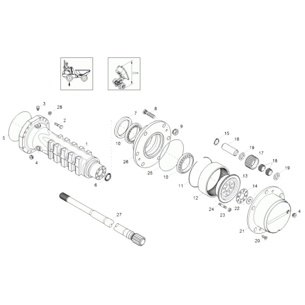 The Axle Case and Wheel Hub Assembly for the Wacker 3001AE Dumper includes essential components for maintaining the rear wheel functionality. This assembly ensures smooth operation and durability under heavy loads. Typical parts include bearings, seals, and fasteners, all designed to fit seamlessly with the Wacker Neuson Dumper.