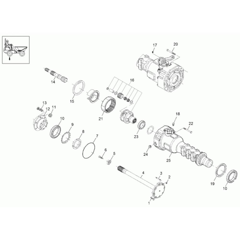 The Axle Case and Wheel Hub (Rear) Assembly for the Neuson 3001 Dumper includes key components essential for the vehicle's rear wheel functionality. This assembly ensures smooth operation and stability, featuring parts such as bearings, seals, and flanges. Designed for durability and compatibility with the Neuson 3001, it supports efficient load handling and manoeuvrability.