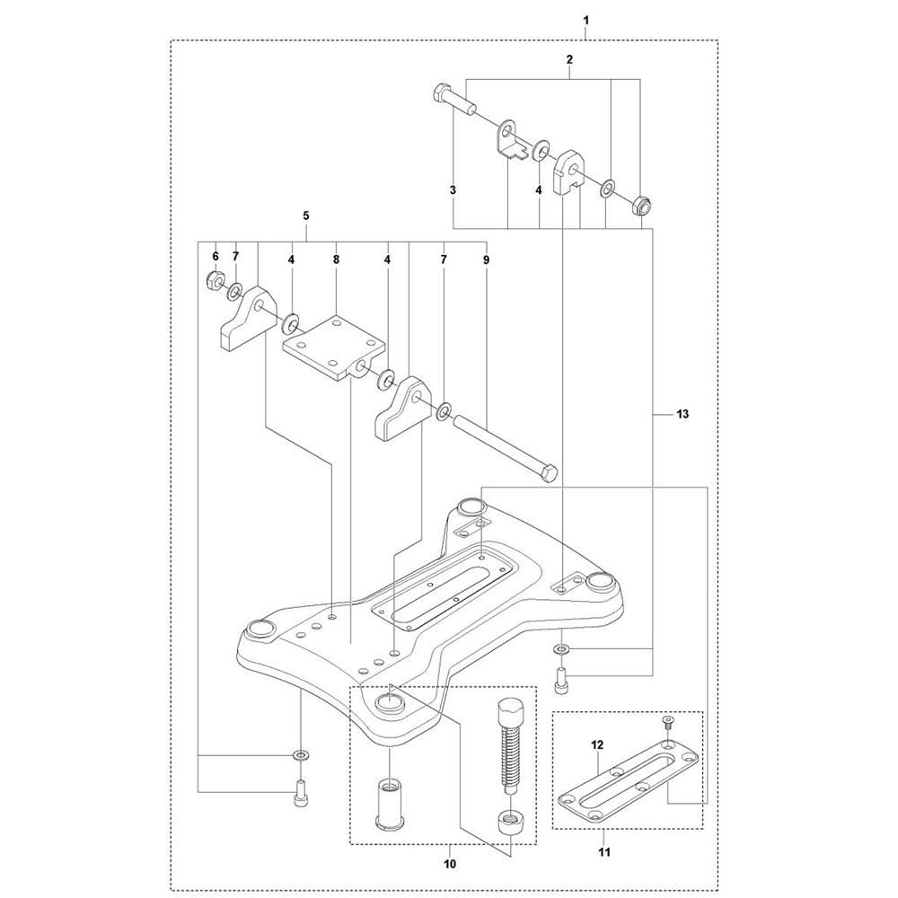 The Base Plate Assembly for the Husqvarna DS 500 Drill Stand is designed to provide stability and support during drilling operations. This assembly ensures precise alignment and secure positioning of the drill stand, enhancing performance and safety. It includes components such as mounting brackets, bolts, and stabilising elements, all crafted to fit seamlessly with the Husqvarna DS 500 model.