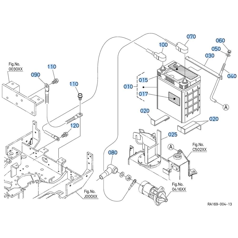 The Battery Assembly for the Kubota U10-5 Mini Excavator includes essential components to ensure reliable power delivery and performance. Designed for the specific needs of the U10-5 model, this assembly helps maintain optimal operation by providing consistent electrical output. Genuine Kubota parts ensure compatibility and durability, supporting efficient machine function.
