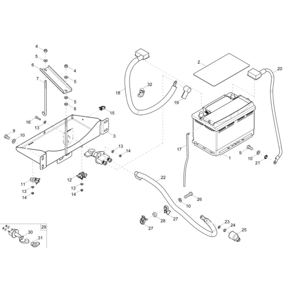 The Battery Assembly for the Wacker EZ50 Mini Excavator is designed to ensure optimal power delivery and reliability. This assembly includes components essential for maintaining the excavator's electrical system, such as connectors, terminals, and cables. Genuine Wacker Neuson parts ensure compatibility and performance, supporting efficient operation in various construction tasks.