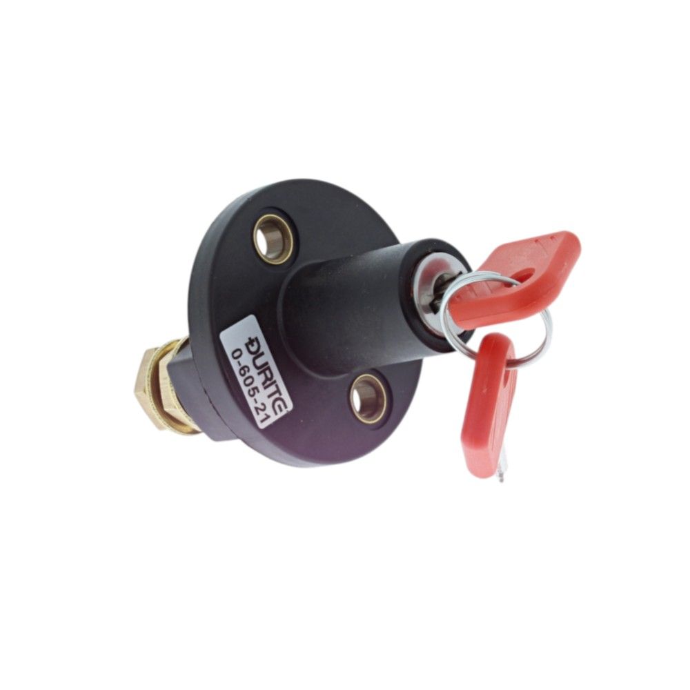 The Durite Battery Isolator with Removable Key in Off Position - 75A 24V - Each - 0-605-21 is an essential safety and security device designed for a wide range of machinery and vehicles. This robust unit is specifically configured to disconnect the battery from the electrical system, helping to prevent theft, electrical fires, and battery drain when the machinery or vehicle is not in use. Rated for 75 amps at 24 volts and capable of handling up to 200 amps for short bursts of 5 seconds, this isolator is built to last. Featuring M10 studs and requiring a 22.5mm (approximately 0.89 inches) installation hole, it is supplied with 2 keys for convenience. Ideal for heavy-duty applications, it's a must-have for safeguarding your equipment.