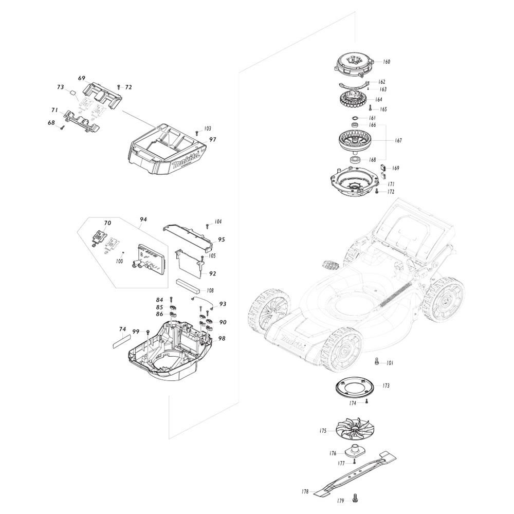 The Battery and Motor Assembly for the Makita LM001G Mower includes key components essential for the efficient operation of this cordless lawnmower. Designed to ensure optimal performance, the assembly features genuine Makita parts that provide reliable power and durability. Options are available for different battery capacities and motor specifications to suit various mowing needs.
