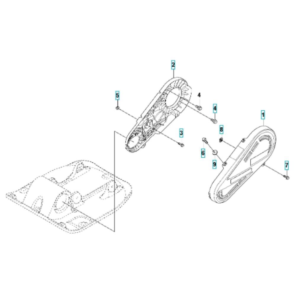 The Belt Guard Assembly for the Husqvarna LF 130 LT Diesel Compactor is designed to protect the belt mechanism, ensuring optimal performance and longevity. This assembly includes key components such as covers and fasteners, which safeguard the belt from debris and damage during operation. Essential for maintaining the compactor's efficiency and reliability.
