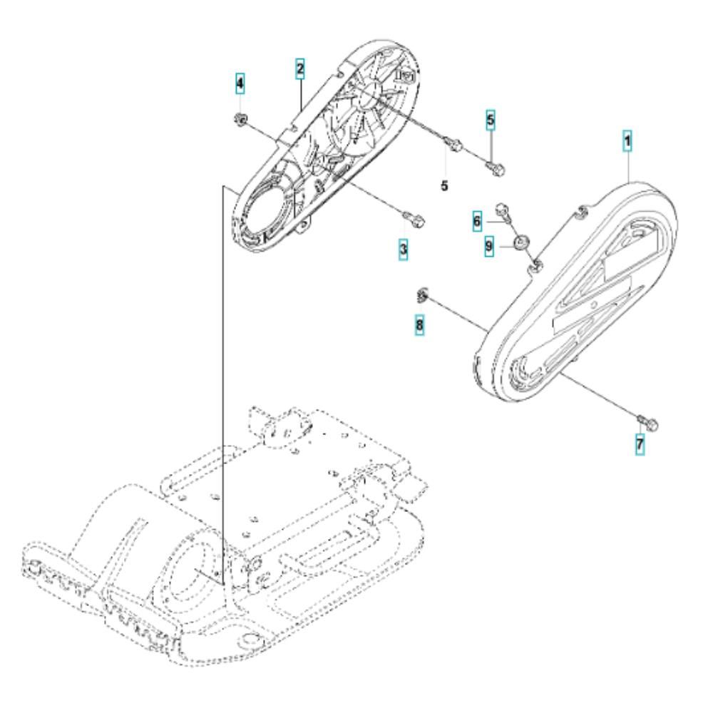 The Belt Guard Assembly for the Husqvarna LF 60 LA Compactor is designed to protect the belt system, ensuring optimal performance and longevity. This assembly includes components such as covers, fasteners, and brackets, which help shield the belt from debris and damage during operation. Essential for maintaining the compactor's efficiency, it is a vital part of routine maintenance.