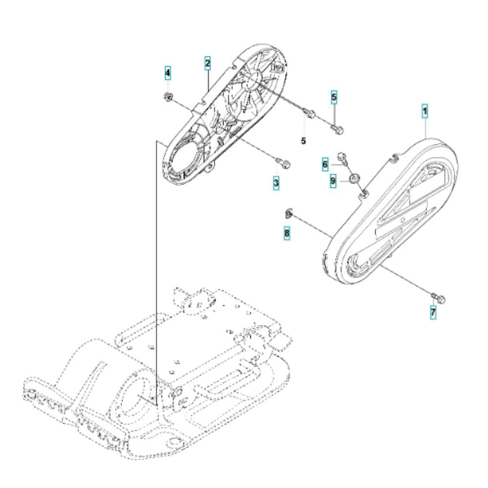 The Belt Guard Assembly for the Husqvarna LF 60 LAT Compactor is designed to protect the belt and other internal components from debris and damage during operation. This assembly ensures the compactor runs smoothly and efficiently, reducing wear and tear. It includes various components such as covers, fasteners, and brackets, all engineered to fit perfectly with the Husqvarna model.