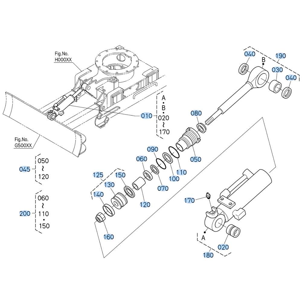 The Blade Cylinder Assembly for the Kubota U10-5 Mini Excavator is designed to ensure efficient operation and durability. This assembly includes critical components such as pistons, seals, and rods, which work together to control the blade's movement. Genuine Kubota parts guarantee compatibility and reliability, essential for maintaining the excavator's performance in various construction tasks.