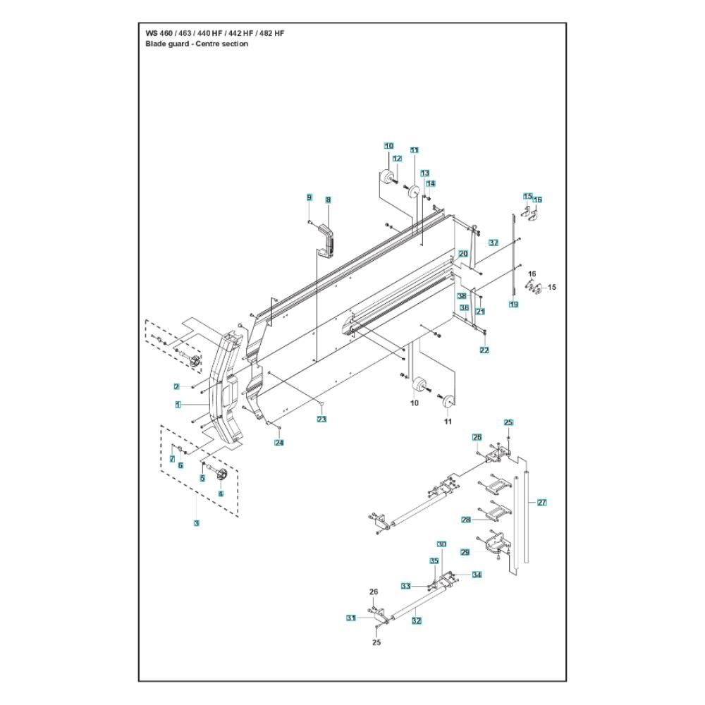 The Blade Guard Centre Assembly for the Husqvarna WS 462 Wall Saw is designed to ensure safe and efficient cutting operations. This assembly includes components that protect the blade and operator, maintaining optimal performance. Essential for routine maintenance, it helps prolong the lifespan of the wall saw by safeguarding against debris and wear.
