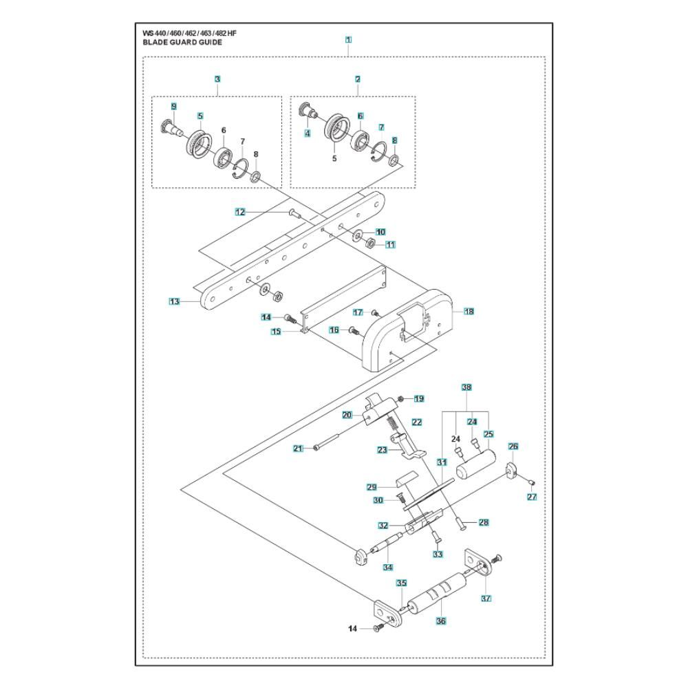 The Blade Guard Guide Assembly for the Husqvarna WS 442 HF Wall Saw is designed to ensure safe and precise cutting operations. This assembly includes components such as guards, brackets, and fasteners, which help maintain blade alignment and protect the operator. Essential for maintaining the saw's performance and safety standards, it is a crucial part of routine maintenance.