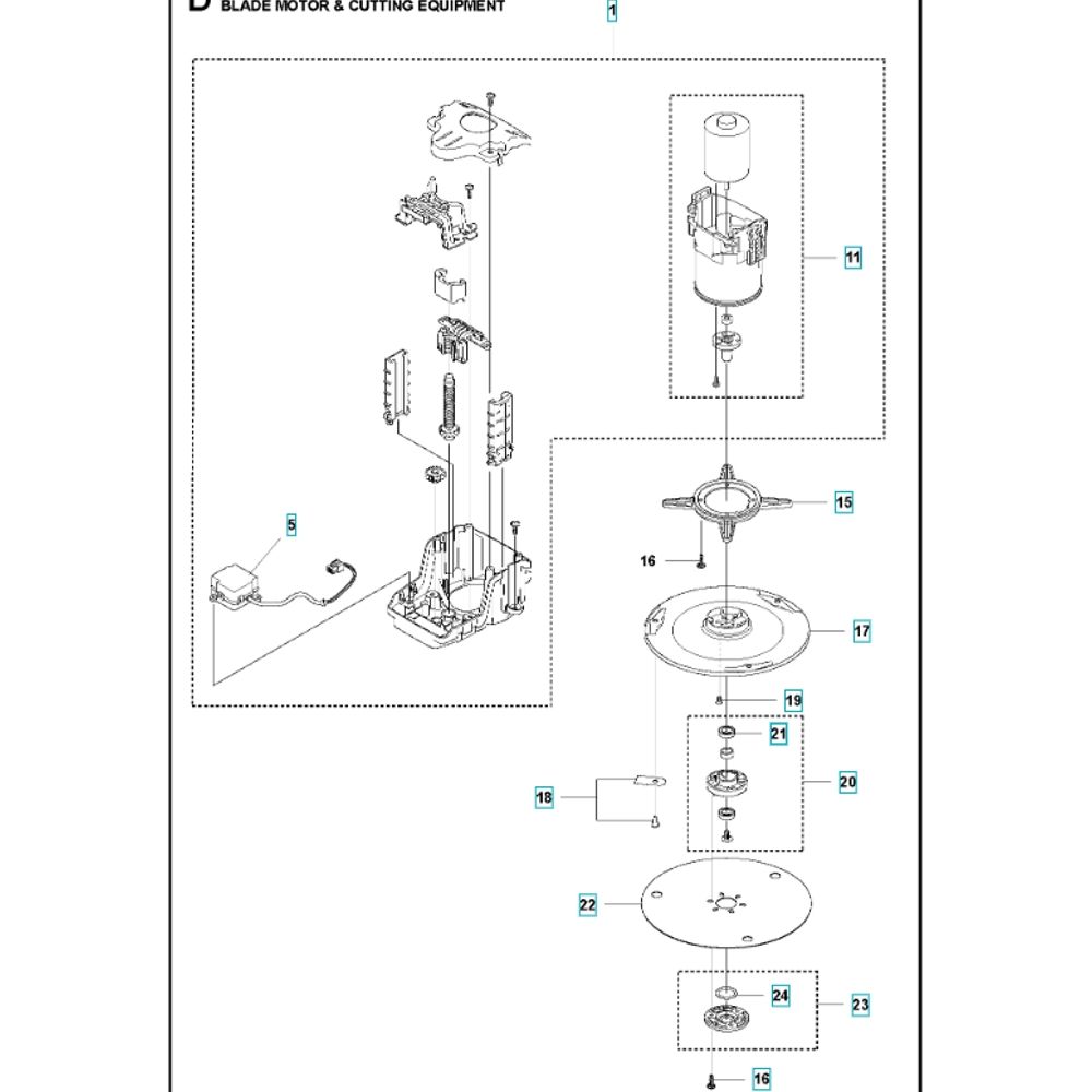 The Blade Motor Assembly for the Husqvarna Automower 415X is designed to ensure optimal cutting performance and longevity. This assembly includes key components such as the motor, blade holder, and connecting elements, all essential for maintaining the mower's efficiency. Genuine Husqvarna parts guarantee compatibility and reliability, supporting smooth operation and precise cutting results.