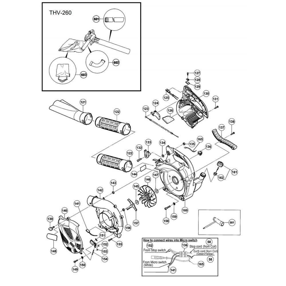 The Blower Assembly for the Tanaka THB260PF Blower includes genuine Tanaka parts designed to ensure optimal performance and longevity. This assembly is crucial for maintaining efficient airflow and reducing wear on the blower's engine. Components typically include housings, impellers, and seals, all crafted to fit seamlessly with the Tanaka THB260PF model.